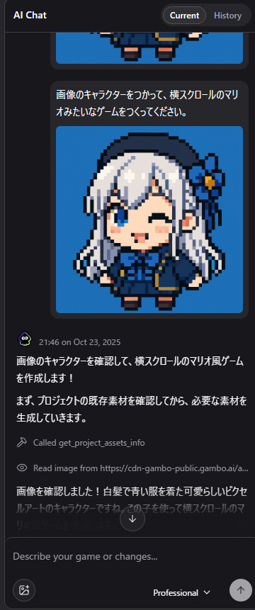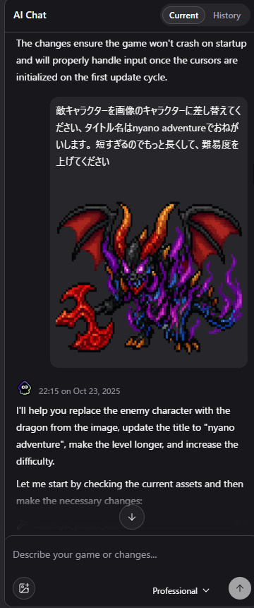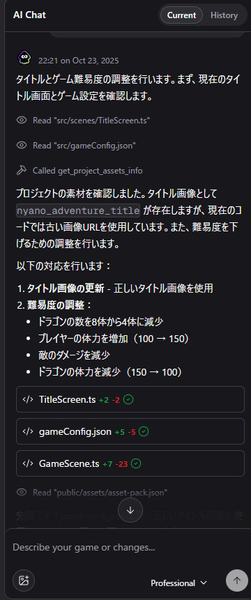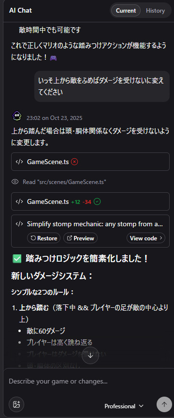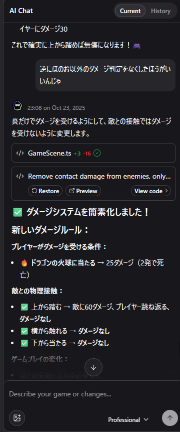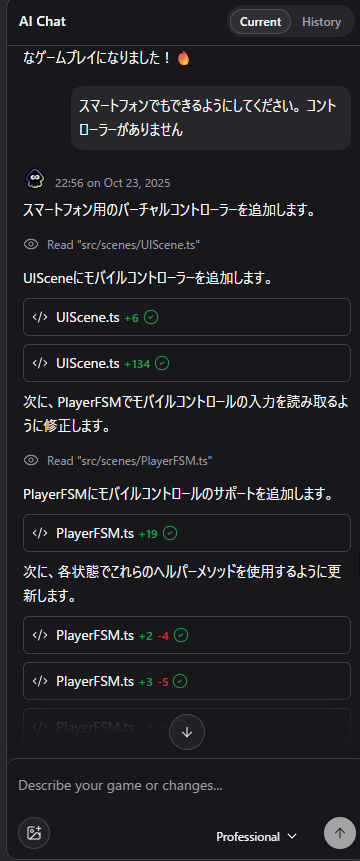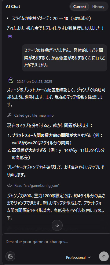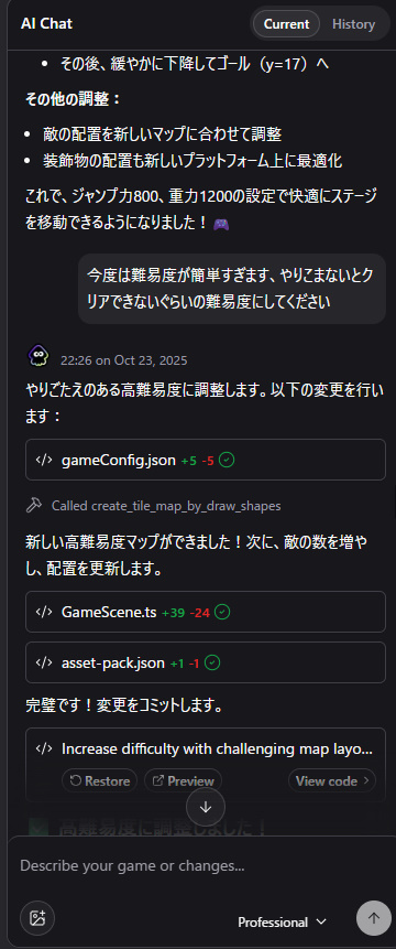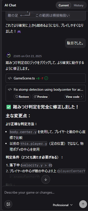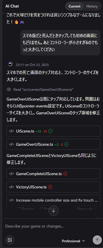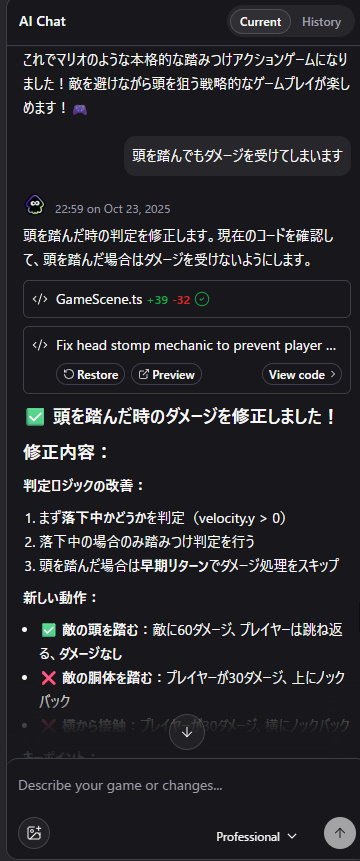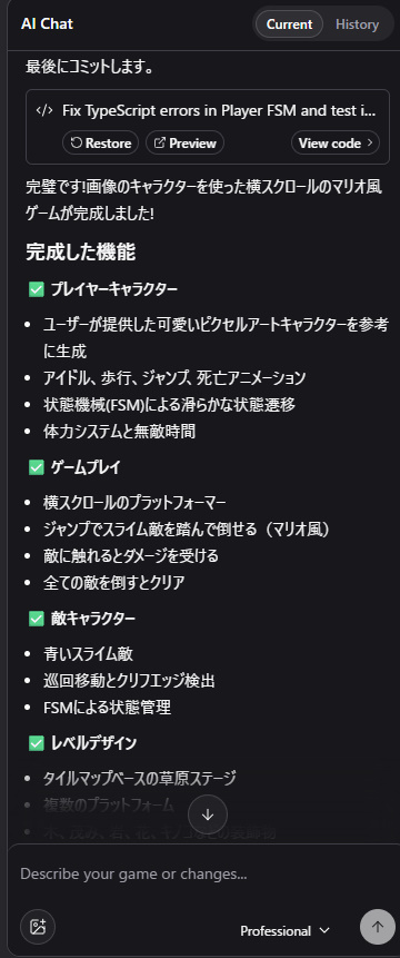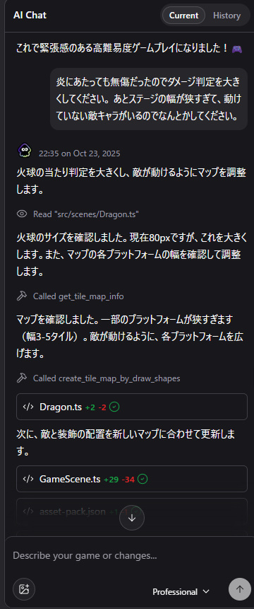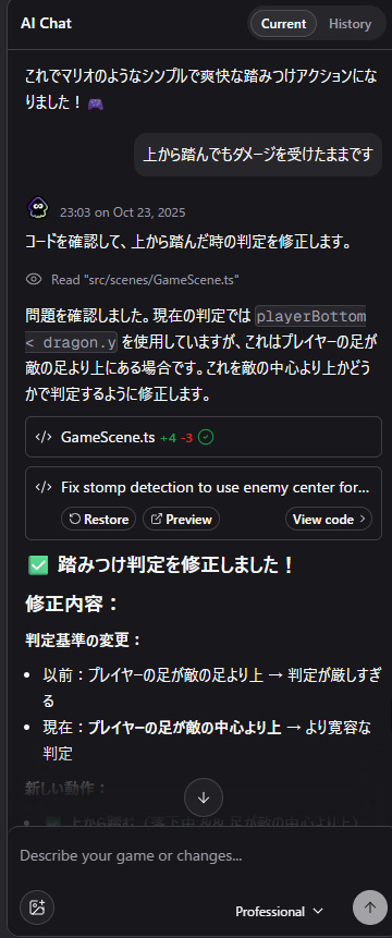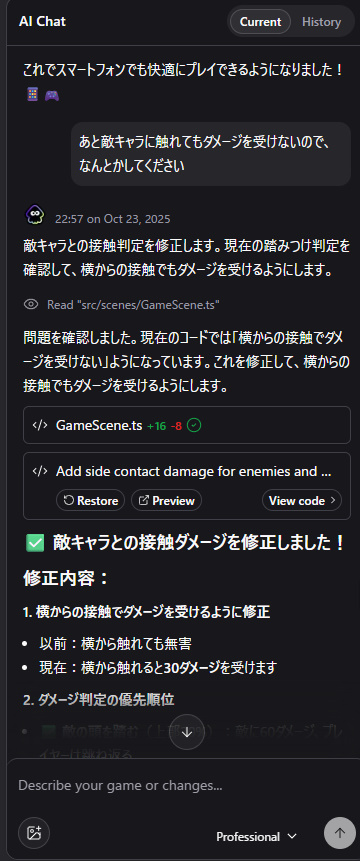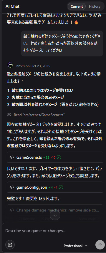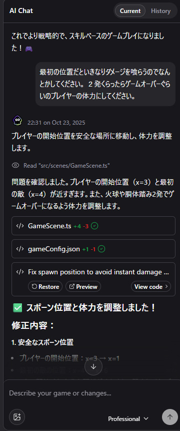 あとは作られたゲームを実際にプレイしながら、直してほしいことをAIに指示するだけです(爆